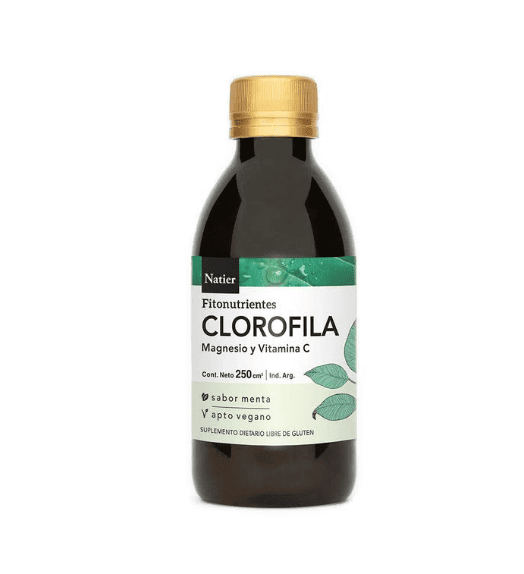 Con Magnesio y Vitamina C. La clorofila es el pigmento verde que se encuentra en los cloroplastos de plantas y algas. Aprovecha la energía del sol en el proceso de fotosíntesis y ayuda en funciones metabólicas tales como la oxigenación y el crecimiento celular. Natier obtiene su concentrado bebible combinando 3 fuentes naturales que aportan todos los beneficios de este maravilloso activo vegetal; alfalfa, spirulina y espinaca. Sus beneficios más importantes son: ayuda a eliminar toxinas del cuerpo equilibrando su metabolismo, mejorando la apariencia de la piel y disponiendo de mayor energía de una forma natural. Combate el estrés oxidativo, estimula la producción de flora bacteriana indispensable para un correcto proceso digestivo y calma la acidez estomacal. Además es una fuente rica en nutrientes como calcio, hierro y magnesio. Actúa como un desintoxicante general, regula el pH en dietas alcalinizantes y combate el mal aliento (Halitosis). Las propiedades de este jugo son realmente asombrosas, te invitamos a experimentar sus increíbles beneficios. ¿Cómo se toma? Ingerir una cucharada de 5 ml, 1 a 2 veces al diarias, 3 horas antes o despues de las comidas grandes del dia, acompañada de un vaso con abundante cantidad de líquido para su completa y correcta asimilación. · NO CONTIENE SUSTANCIAS SINTÉTICAS · NO GENERA EFECTOS SECUNDARIOS