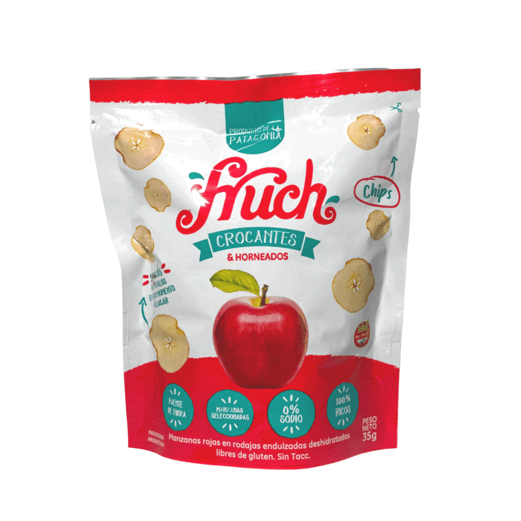 Snack de manzana roja 100% natural, crocantes y horneados. Libre de gluten y sin conservantes. PRODUCTO 100% ELABORADO EN LA PATAGONIA. -APTO CELIACOS. -0% SODIO -ALTO EN FIBRA -0% GRASAS Ingredientes: Manzana, azúcar. Fruch Patagonia SAS es un emprendimiento familiar radicado en la Ciudad de Cipolletti que busca generar valor agregado a la principal materia prima regional del Alto Valle. Después de años de prueba y ensayos, logramos desarrollar un nuevo proceso de horneado mediante el cual se obtiene un producto deshidratado extremadamente CROCANTE y “con todo el sabor de la Manzana”.