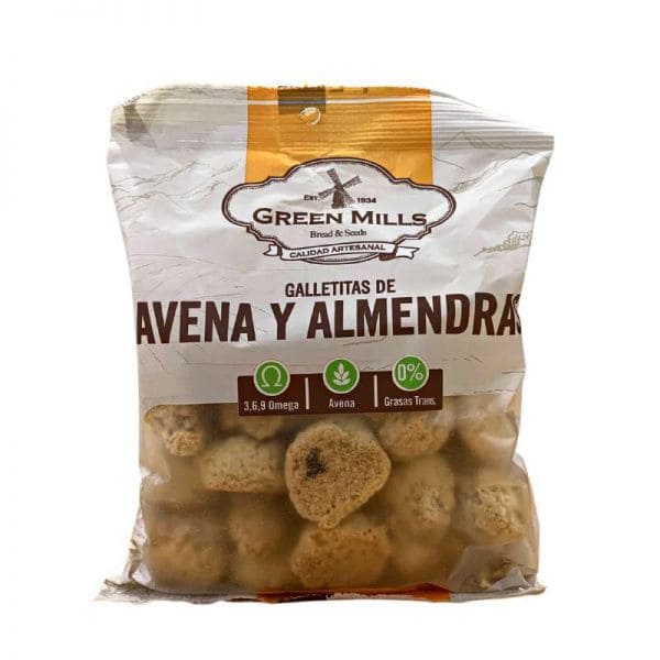 Galletitas dulces de avena y almendras Usos: Ideales para consumir en desayunos, meriendas o como colación. Ingredientes: Harina de trigo enriquecida ley 25630 (sulfato ferroso, niacina, vitamina B1, ácido fólico, vitamina B2), avena gruesa, azúcar, aceite vegetal, huevos en polvo, almendras, castaña de cajú, esencia artificial de vainilla, esencia artificial de almendras. Contiene gluten. Puede contener trazas de soja y maní. Valor Nutricional: Valor Energético: 173Kcal=724Kj (9%VD); Carbohidratos: 22g(7%VD); Proteínas: 3,6g(5%VD); Grasas Totales: 7,8g(14%VD); Grasas Saturadas: 0,83g(4%VD); Grasas Trans: 0 g; Fibra Alimentaria: 1,9g(8%VD); Sodio: 6,3mg(0%VD); Porción: 50g (10 galletitas). * Los porcentajes de los valores diarios están basados en una dieta de 2000 kcal (8400 kJ). Sus valores diarios pueden ser mayores o menores dependiendo de sus necesidades energéticas.