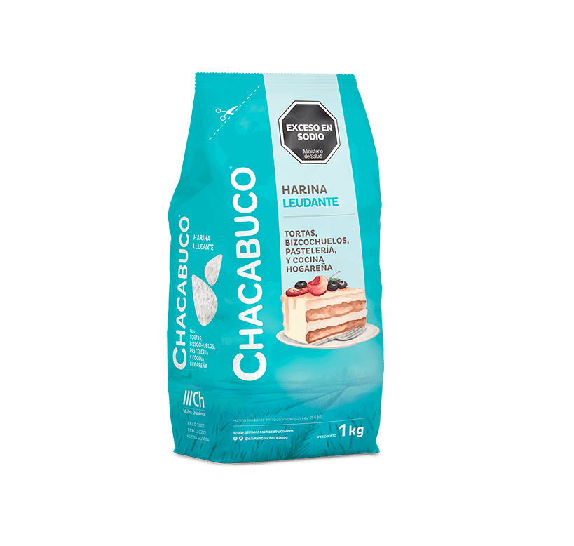 La harina leudante Chacabuco®es obtenida a partir de la selección de nuestros mejores trigos. Es el producto más indicado para la elaboración de tortas, bizcochuelos y pastelería hogareña. Su calidad la hace ideal para preparar toda clase de platos que requieran una harina pensada especialmente para la cocina. Harina de trigo 000 enriquecida según ley 25630 (*), sal y leudantes químicos INS 500ii y INS 541i. Contiene derivados de trigo. Puede contener soja. (*)Hierro = 30mg/kg, Ácido Fólico = 2,2 mg/kg, Tiamina (B1) = 6,3 mg/kg, Riboflavina (B2) = 1,3 mg/kg, Niacina = 13 mg/kg.