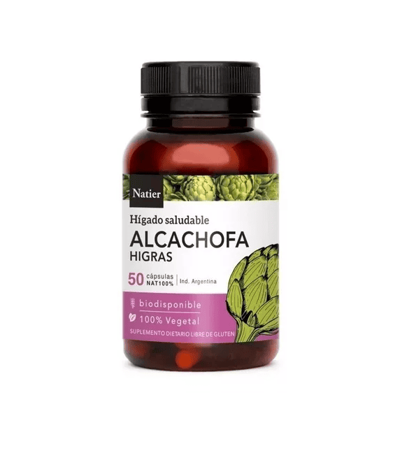 La alcachofa es una de las fuentes vegetales más ricas en calcio, hierro, magnesio y potasio. También contiene fibra y cinarina, un compuesto que ha sido estudiado por estimular el funcionamiento del hígado. Este compuesto de sabor amargo que se encuentra en las hojas, mejora la función del hígado y de la vesícula biliar, estimula la secreción de jugos gástricos y disminuye los niveles de colesterol en sangre. A nivel digestivo la alcachofa contiene mucha fibra que ayuda a combatir el estreñimiento. Como complemento en dietas de adelgazamiento ayuda a evitar la retención de líquidos y eliminar grasa a través de la billis. Natier utiliza para su formulación 100% extracto concentrado de alcachofa con el objetivo de lograr mayor potencia en los beneficios y propiedades nutricionales, superando exigentes controles de calidad. · AYUDA A MANTENER EL HÍGADO SALUDABLE · FAVORECE AL METABOLISMO DE LOS NUTRIENTES · CONTRIBUYE AL CONTROL DEL COLESTEROL · NO CONTIENE SUSTANCIAS SINTÉTICAS · NO GENERA EFECTOS SECUNDARIOS MODO DE USO Ingerir de 1 cápsula diaria antes de las principales comidas con abundante cantidad de líquido para su completa asimilación. PRESENTACIÓN Envases de 50 cápsulas, Ingredientes: 400 mg de extracto de Alcachofa (15 mg de Vitamina C)