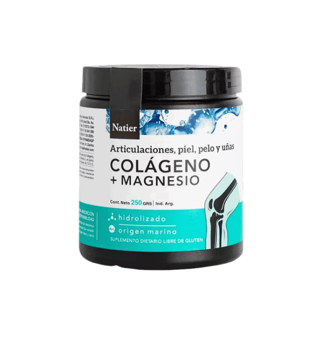 Articulaciones, músculos, piel, pelo y uñas saludables. El colágeno es el componente básico de cartílagos, discos intervertebrales, ligamentos, tendones, huesos, la piel, cuero cabelludo, encías, paredes de los vasos sanguíneos y córnea ocular. El aporte nutricional de fibras de colágeno proporcionan resistencia y capacidad de tracción y compresión a ligamentos, tendones y músculos; refuerzan las paredes de los vasos sanguíneos y linfáticos; regeneran las encías; fortalecen el tejido epitelial y ayudan a aumentar la densidad ósea. A los 25 años comienza a disminuir la capacidad de nuestro cuerpo en regenerarlo y a partir de los 40 su síntesis se reduce un 1% cada año. Por lo tanto, a los 70 años se ha perdido un 30%. El envejecimiento no destruye el colágeno, sino que incide en una menor producción y en el endurecimiento de las fibras. Nuestra combinación enriquecida con magnesio mejora su síntesis proteica y su funcionamiento osteomuscular. Mantiene los tejidos y articulaciones saludables, jóvenes y sin dolor. Enriquecido con magnesio mejora su absorción y biodisponibilidad. Ingredientes: Hidrolizado de colágeno, Carbonato de Magnesio, Vitamina C (Ácido Ascórbico), Ácido Cítrico y Extracto de Mango. MODO DE USO Ingerir 1 cucharada de polvo al ras (provista en el envase) diluida en un vaso de agua en cualquier momento del día.