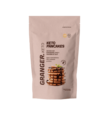 Seamos honestos, comer saludable es difícil. Nosotros lo hacemos fácil. Los pancakes de avena son una receta muy utilizada por deportistas y gente que cuida su alimentación, pero no son compatibles con una dieta Keto. Por tal motivo, te presentamos estos Keto pancakes, que satisfacen tus requerimientos de macronutrientes. Hechos con harina de almendra, castanias de caju y coco, proporcionan un desayuno o merienda bajo en carbohidratos y alto en proteínas. Modo de preparación: 1- Colocar proporciones de polvo y agua o leche según lo indicado en un recipiente. 2- Mezclar con tenedor. 3- Cocinar a sartén precalentada y rociada con aceite a fuego medio aproximadamente 1,5 minutos por lado. Probalos calientes y fríos. ¡Combinalos con pasta de maní, miel, frutos secos o con tus frutas preferidas! Ingredientes: harina de castanias de caju, harina de coco, huevo en polvo, polvo para hornear, ARO: Vainilla, EDU: INS 955